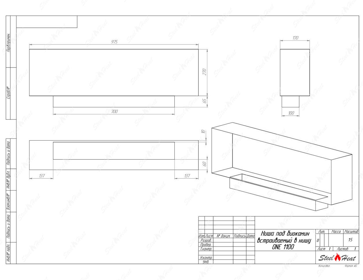Встраиваемый Биокамин SteelHeat ONE-H 1100 предназначен для встраивания в глухие ниши из гипсокартона, кирпича, пеноблоков, бетона.